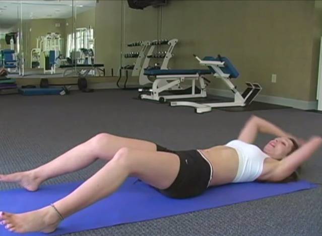 お腹の上部を鍛える運動。床に寝て、膝を曲げながら立てる。両手は頭の後ろに伸ばした状態で、膝と足は肩幅に開く。